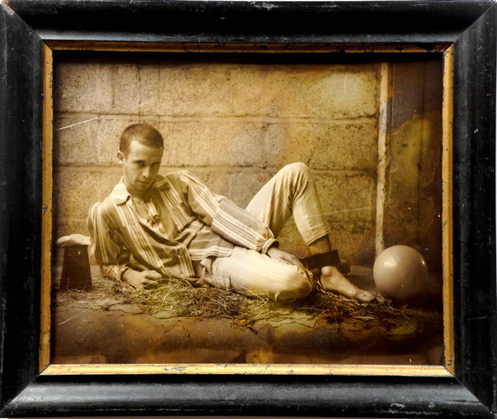Pascal Mirande revisite les siennes, celles qui ont grandi en lui, avec lui, celles qui l’ont fait grandir aussi sans doute, comme un trésor. Loin de ceux que la Culture pétrifierait (Par où commencer ? Que puis-je encore faire ? Et toutes ces questions qui hantent nécessairement tout artiste débutant devant l’évidence des pistes explorés par ses prédécesseurs) Pascal Mirande se conduit en joyeux iconoclaste et s’attaque à la galerie de portraits qu’a véhiculée notre imaginaire occidental : le naufragé, le prisonnier…Rejouer le stéréotype c’est revisiter l’idée en la réalisant à nouveau : les codes deviennent jeu. Forcer le trait, accentuer le détail, surjouer un peu pour toucher le processus au cœur. Un jeu qui requiert d’ailleurs de l’intuition et une attention fine aux intentions et à la matérialité de l’imagerie originale. Se fondre dans un Nadar ou une papier salé qui se souviendrait d’une toile d’une école picturale du XIXème siècle, tout cela appelle de la présence et de la distance à la fois : le format quasi réaliste des clichés (contact façon petite chambre), la juste texture d’un papier ancien, l’utilisation de la lumière sur le modèle, l’étude des attitudes…De la posture à l’imposture revendiquée joyeusement ; la ligne est ténue et Pascal Mirande en équilibre sur le fil.